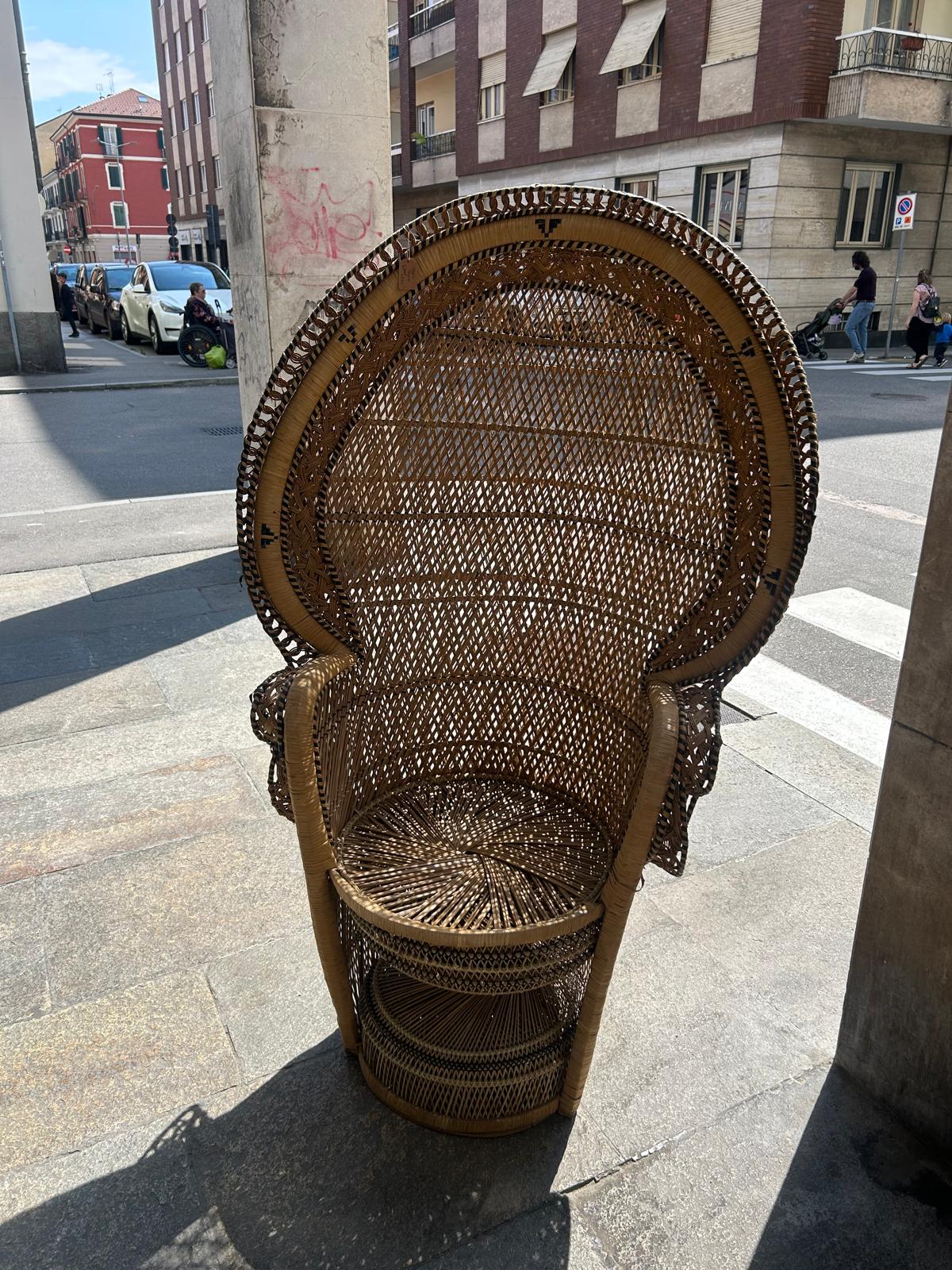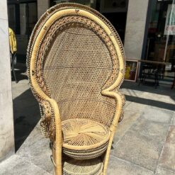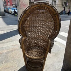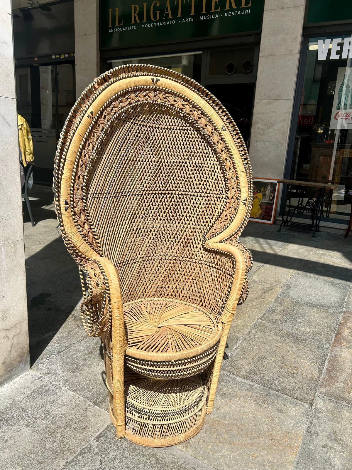 Affascinante e scenografica sedia “Peacock” in vimini intrecciato, originale degli anni ’60/’70, caratterizzata dal suo schienale alto a forma di ventaglio o piumaggio di pavone, da cui prende il nome. Simbolo di eleganza bohémien e stile esotico, è stata resa celebre da riviste, set fotografici e film cult come Emmanuelle.