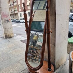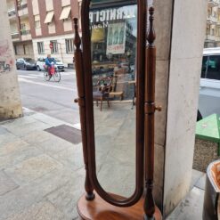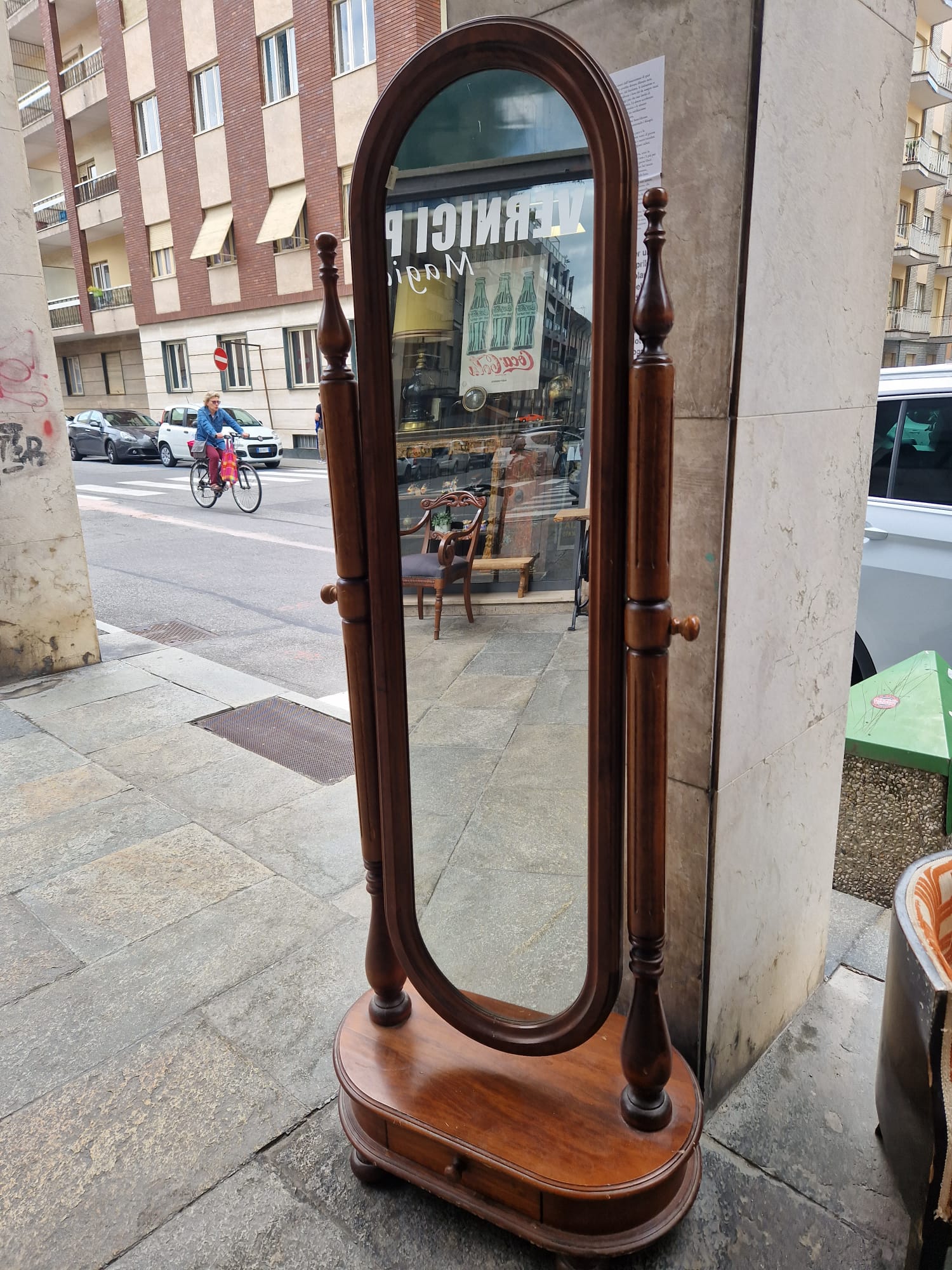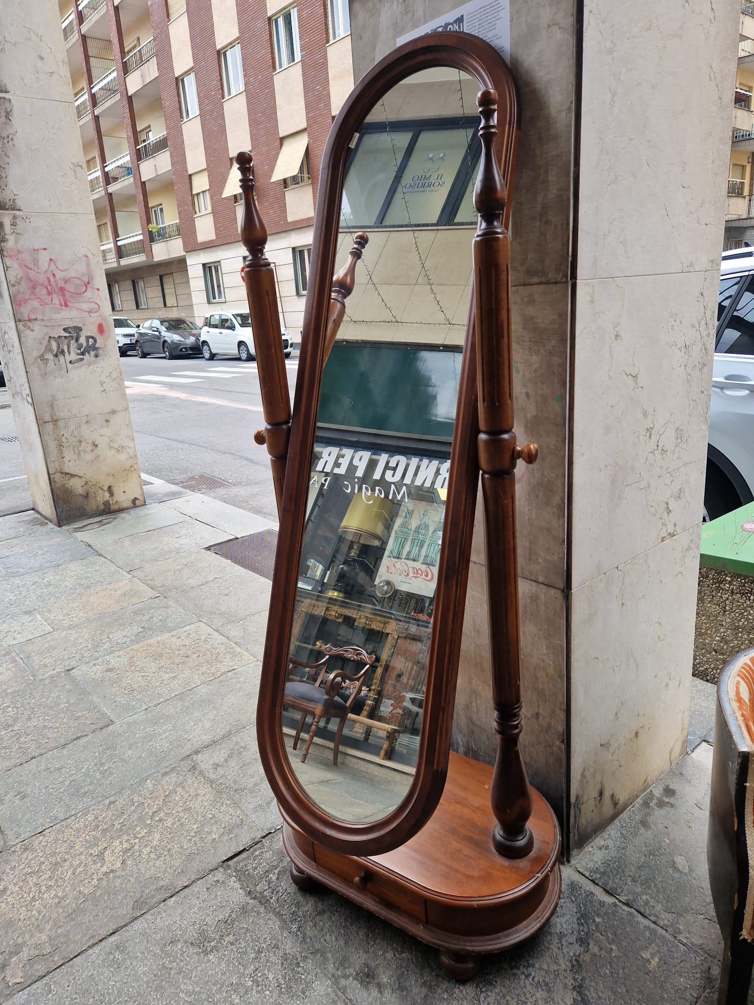 Elegante specchiera da terra a psiche in legno massello finemente tornito, con struttura basculante che consente l’inclinazione dello specchio a seconda delle esigenze. Il telaio ovale, sorretto da due colonne laterali sagomate con pomelli in stile classico, si poggia su una solida base con piano sagomato e cassetto frontale integrato, utile per riporre piccoli oggetti o accessori.